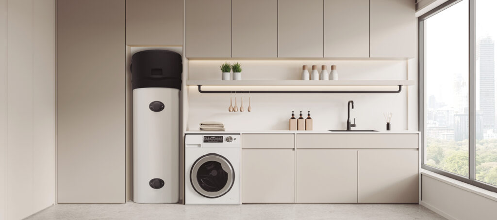 Dodává horkou vodu o teplotě 60 °C pouze pomocí tepelného čerpadla